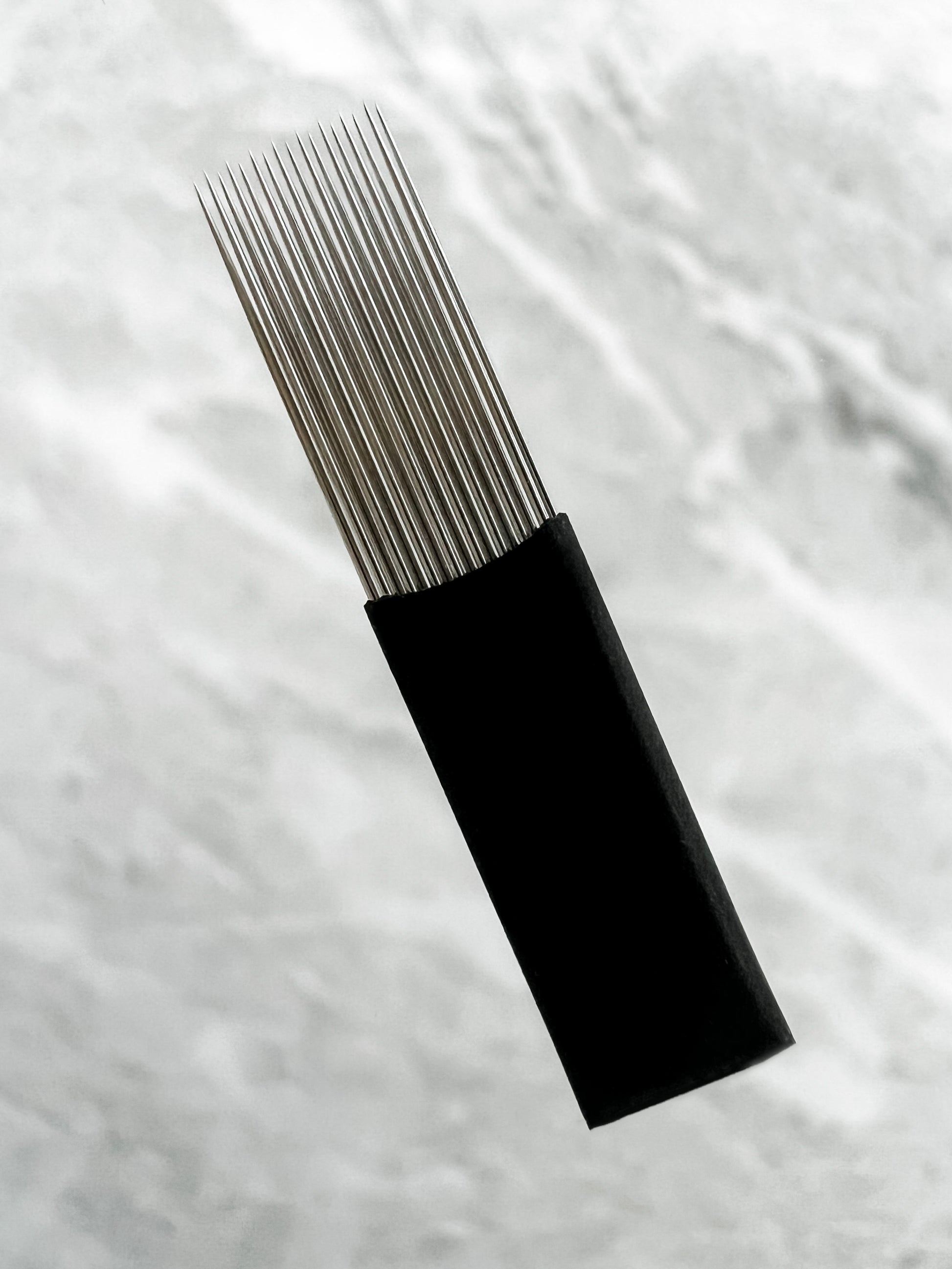 This quality manual shader is comprised of 17 needles made of 304 stainless steel at a 0.25mm diameter. The 17 needles of the shader are arranged in 2 flat rows. This is ideal for manual shading (for added density in between hairstrokes), or for a soft outline of an ombré/powder brow.